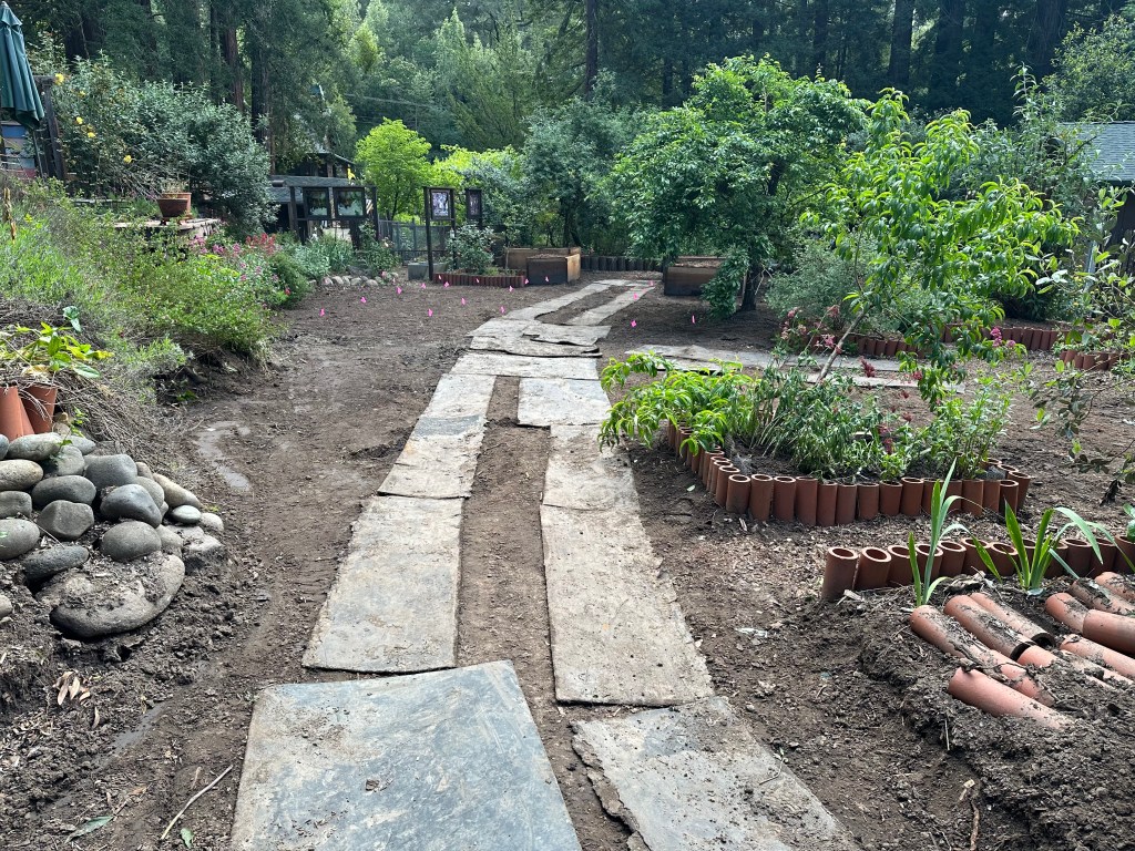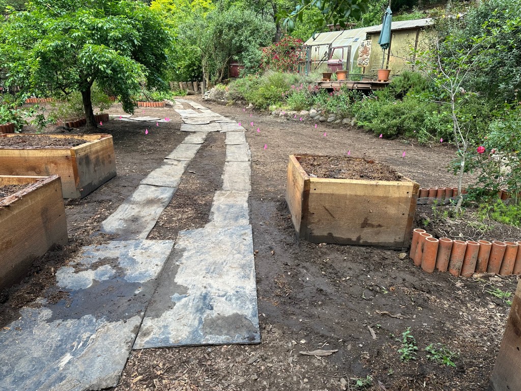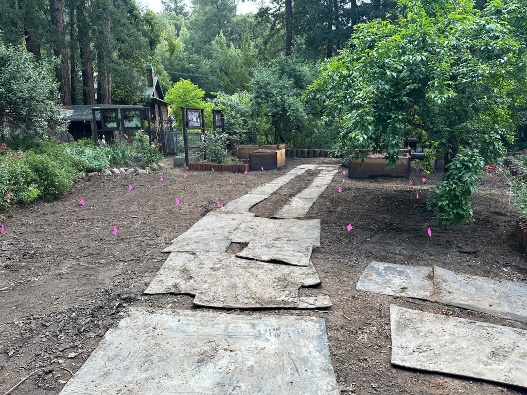 To wrap it up and plan for the middle section, we laid out the old mats to mark the tractor’s travel pathway and turn around spot. This helped with a visual to frame in the next set of redwood boxes. The garden walkways will be covered in wood chips, so the mats will not show. Rich came over around 3pm, and we flagged the next 6 boxes that he’ll build in May.