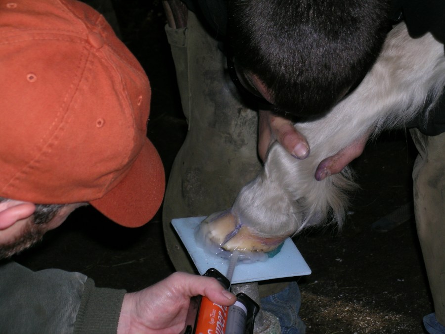 Step 4: Adhere is applied on the outside of the hoof to glue on the shoe and support the crack. Then, all the adhesive is filed down.