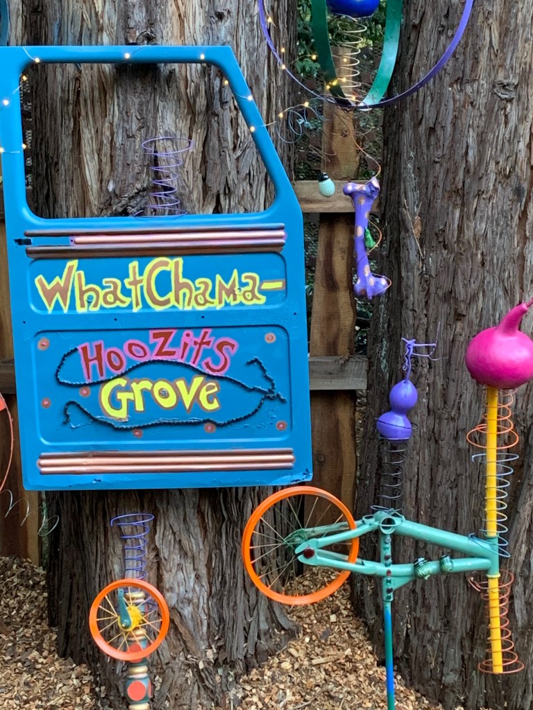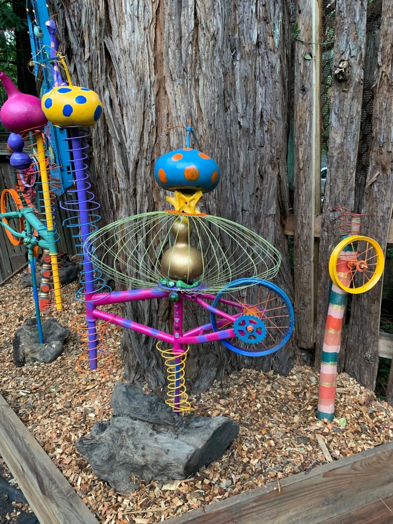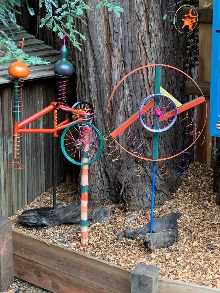 Fun art project completed for back of the redwood grove that faces our deck. I can also see it out the kitchen window. I had 3 kid’s bike frames I had wanted to use for the dragonfly gong, and a jeep door I thought about using for the farm fence. These leftovers turned out perfect for this whimsical space.